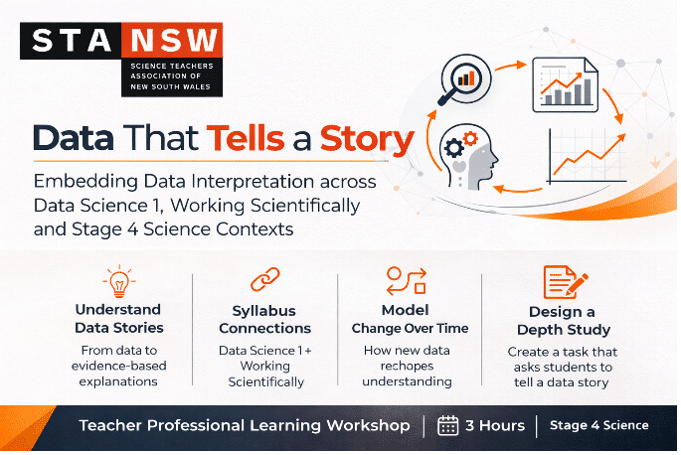 This professional learning short course is designed to provide teachers with explicit opportunities to explore the idea of a scientific data story, what it involves, and how to design learning that helps students move from reading data to using data as evidence. The course supports teachers to build that understanding and apply it directly to Stage 4 Science programming. Through syllabus alignment, task analysis and guided planning, participants will explore how students can use secondary data to identify patterns, compare model iterations, evaluate how scientific understanding has changed over time, and communicate a coherent data story within a nominated scientific context.
