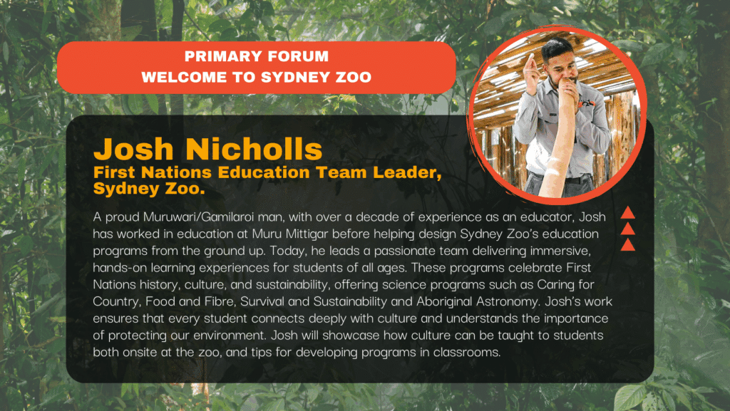 Josh will welcome teachers to Sydney Zoo, and increase teacher confidence when engaging students in First Nations perspectives via a demonstration to get teachers hands on with culturally safe activities to share back in the classroom.